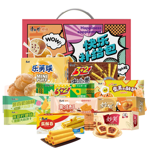 3+2苏打夹心饼干125g×1袋 咸酥夹心饼干80g×1袋 蛋黄也酥酥蛋黄饼干80g×1袋 蛋酥卷108g×1袋 妙芙欧式蛋糕96g×1盒 妙芙法式蛋糕100g×1盒 乐芙球50g×1盒 夹心卷55g×1盒 美味酥咸饼干80g×1袋 甜酥夹心饼干80g×1袋